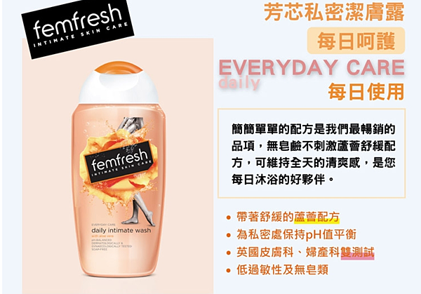 使用femfresh芳芯 私密潔膚露-每日呵護款這幾年來,讓我都不用分心去擔憂自己的私密問題。真的是一款我會一直愛用下去的好朋友!!